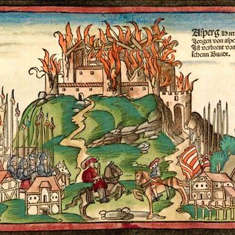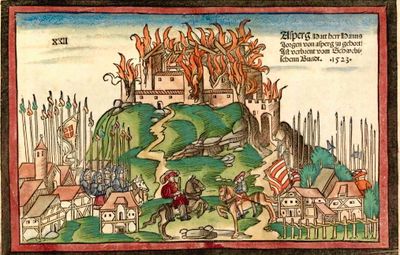 Hans Wandereisen's woodcut from 1523 captures the castle's destruction, depicting extensive fortifications and gatehouses engulfed in flames.