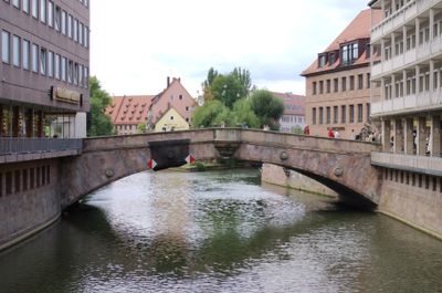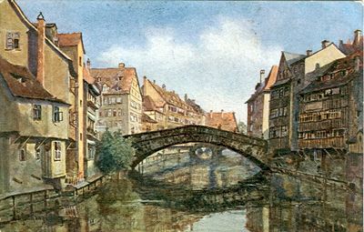The Fleischbrücke is a stone arch bridge with a flat vault spanning the Pegnitz River in Nuremberg. It connects the two historic districts of St. Sebald and St. Lorenz and stretches about 27 meters (89 feet) in length with a width of about 15 meters (49 feet).