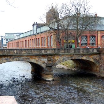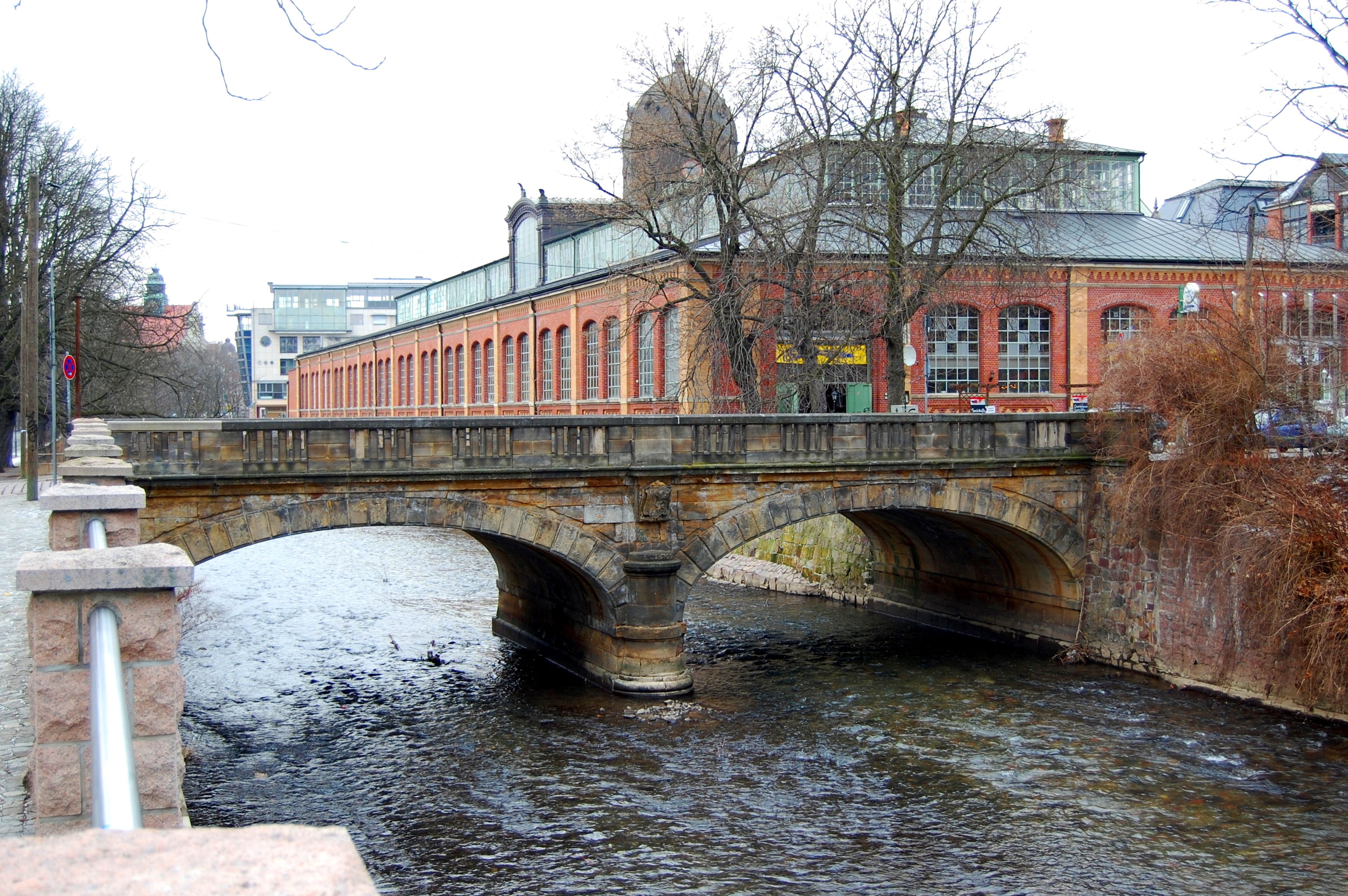 The Bierbrücke spans across the Chemnitz River, connecting different sections of the city with its stone construction and pedestrian pathways.