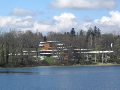 The building features a jetty-like balcony stretching over Lake Starnberg, while the surrounding park displays outdoor sculptures throughout the grounds.