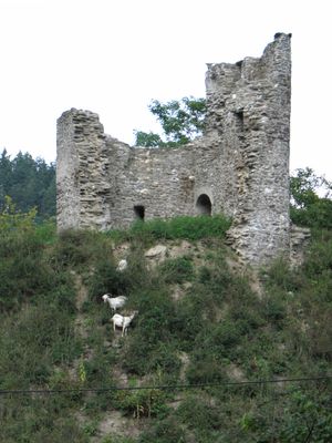 The remnants of the stone castle stand 10 meters tall with a three-story residential tower measuring 7.5 by 6 meters at 200 meters elevation.