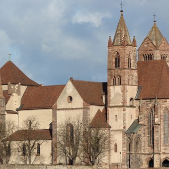 Breisacher Münster stands on Münsterberg hill and combines Romanesque and Gothic features, with two distinctive flank towers framing a steep Gothic choir section. The structure grew through multiple construction phases and features a vaulted basilica layout that creates distinct spatial sections within.