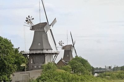 Both mills represent traditional East Frisian milling techniques, with the red mill continuing to produce flour while the green mill houses a tea room and art gallery.
