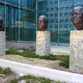 The memorial commemorates the leaders who facilitated German reunification, with the busts installed between 2007 and 2010 near the Axel-Springer building.