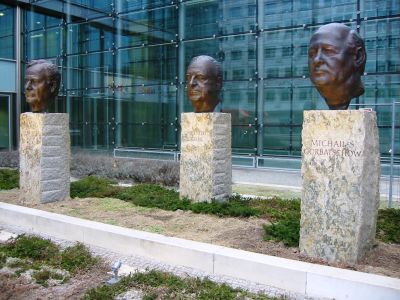 Three granite steles support bronze portrait busts of George Bush, Helmut Kohl, and Mikhail Gorbachev, each weighing 1.3 tons.