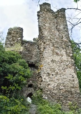 The castle ruins stand on a steep rocky outcrop north of the Wisper River, featuring a square keep and preserved sections of ring walls.