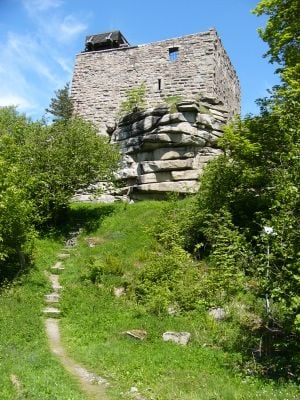 The remains of Epprechtstein Castle stand on a granite slab at 798 meters elevation, featuring an old tower house with stairs leading to an observation platform.