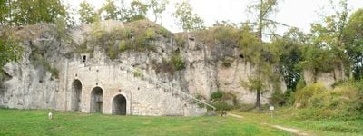 The castle complex includes natural caverns transformed into corridors and chambers, with an open staircase leading through three archways to the upper section.