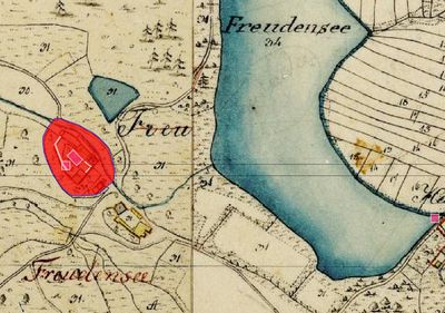 The stone walls and fortified structures of Burg Freudensee stand at coordinates 48.662 latitude and 13.6318 longitude in the Bavarian landscape.