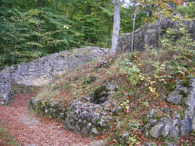 Burg Alt-Lichtenstein is a castle ruin sitting on a steep rocky cliff edge of the Swabian Jura at approximately 800 meters elevation. The remains include partial walls, defensive fortifications, a water collection system, and stone steps cut into rock that connected different levels of the site.