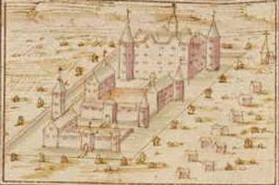 A topographical survey of the Rhineland region between 1801 and 1814 provides an aerial view of the castle complex before its demolition in 1830.