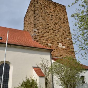 The castle keep now functions as both a church tower for the village and an observation point offering views of Hesselberg and Ries regions.