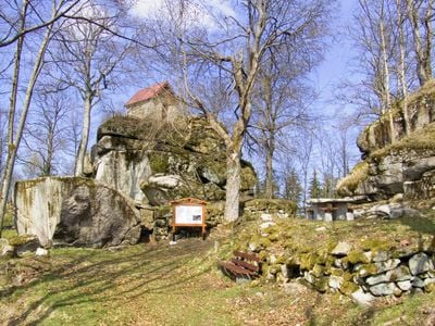 The Haselstein castle ruins stand at 705 meters altitude in the state forest, surrounded by granite rock formations near the market town of Floß.