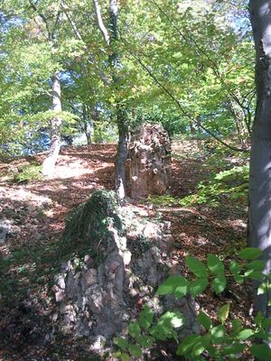 The castle remains stand on a 295-meter-high spur of Darsberg mountain, featuring a shield wall and double rampart structure facing the slope.
