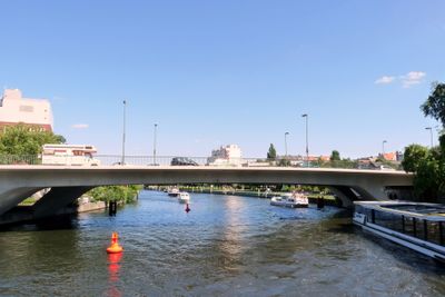 The Caprivibrücke spans across the Spree River with four traffic lanes and two pedestrian walkways, connecting Otto-Suhr-Allee with Kaiserin-Augusta-Allee.