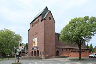 The Christ-König-Kirche features brick expressionist architecture with clean lines and distinctive design elements characteristic of religious buildings in the Ruhr region.