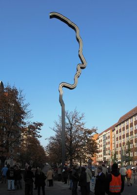 The Georg Elser memorial consists of a 17-meter-high steel structure displaying the silhouette of a face, illuminated from both sides at night.