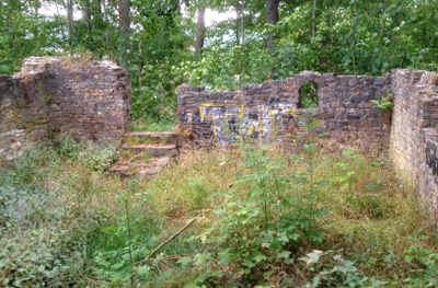 The stone remains of Hünenburg castle stand on Königsberg hill, featuring a residential tower with defensive walls measuring 80 centimeters thick.