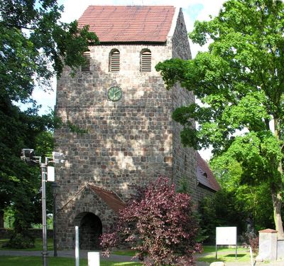 The Dorfkirche Marienfelde features a west tower integrated into the main structure, with a choir section and semicircular apse made of fieldstone.
