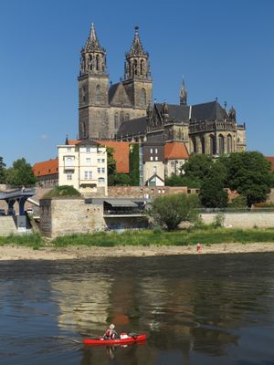 Domfelsen is a rock formation along the Elbe riverbank in Magdeburg that becomes especially visible during low water levels. The structure displays various layers and levels that extend along the shore and allow direct contact with the river.