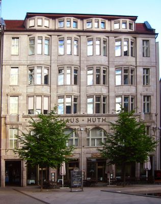 Haus Huth features steel frame construction with muschelkalk plates adorning its exterior walls, exemplifying early 20th-century architectural design elements.