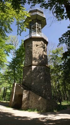 Local residents constructed the sandstone tower in 1928, initially measuring 18 meters, and increased its height in 1972 and 1997 due to growing beech trees.