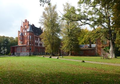 Built between 1853 and 1874, the manor incorporates North German brick Gothic architecture and underwent several modifications until the early 2000s.