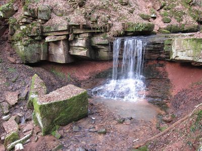 Tretstein is a waterfall in Gräfendorf that winds through a gorge carved into Upper Buntsandstone and forms multiple cascades. The water drops roughly three meters freely before striking angled rock formations, reaching a total height of about six meters.