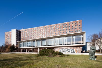 The building was constructed between 1953 and 1955 on the site of former allotment gardens that a stream had crossed. This location was deliberately chosen as Frankfurt rebuilt after wartime damage.