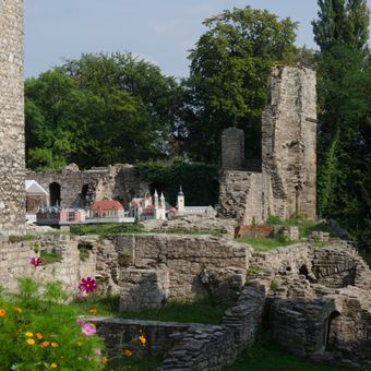 The castle ruins contain an exhibition space displaying detailed miniature models of Arnstadt and the Erfurt Cathedral, representing regional architecture.