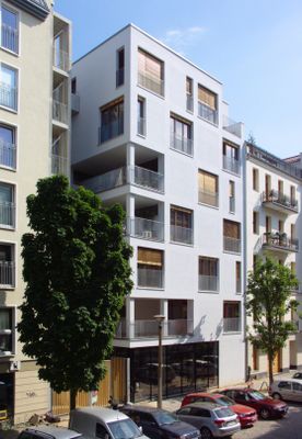 The E3 building reaches seven floors and contains eight residential apartments spread across 987 square meters of living space at Esmarchstraße 3.