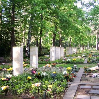 The Heidefriedhof extends across 4 hectares of land surrounded by woodland, containing numerous graves, monuments, and a columbarium for urn burials.