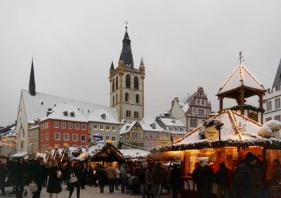 The marketplace features 95 wooden stalls offering handcrafted ornaments, regional foods, and seasonal decorations in front of Trier Cathedral.
