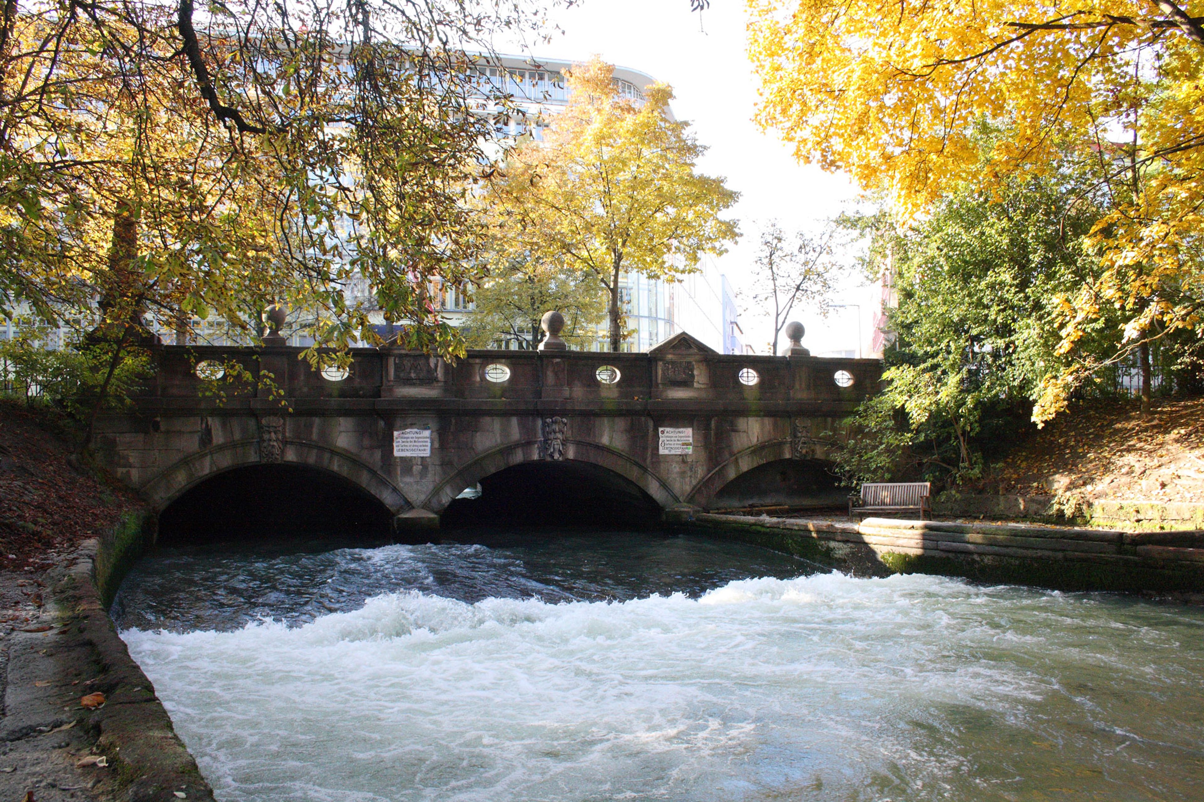 The bridge stands near the Eisbach wave, where river surfers practice their sport throughout the year regardless of weather conditions.