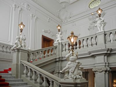 The staircase displays sculptures representing four continents - America, Africa, Asia, and Europe - along with the coats of arms of King Albert and Queen Carola.