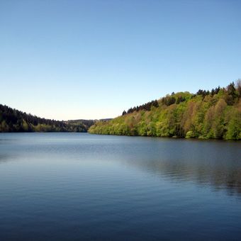 The reservoir features a natural beach area surrounded by forest terrain, combining water activities with direct access to Bavarian Forest hiking trails.