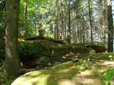 The mountain paths include a trail established in 1953 by historian Friedrich Sprater, who conducted research on the geological formations in the area.