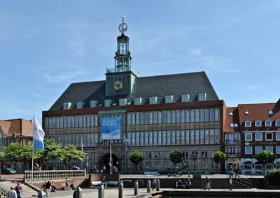 The Rathaus Emden stands at the end of an artificial harbor basin called Ratsdelft, featuring a modern administrative building with clean architectural lines.