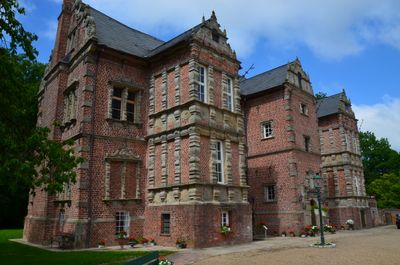 The Erbhof Thedinghausen features a two-story brick construction with detailed sandstone elements along its exterior walls and Renaissance architectural elements.