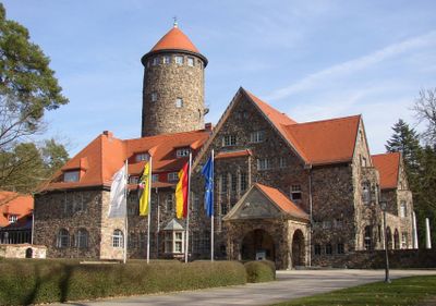 The entrance portal displays a wolf relief, reflecting the von Wulffen family name, who commissioned and owned the property in the early 20th century.