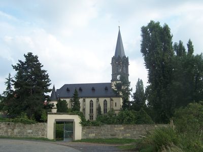 Emmauskirche is a Lutheran church in Dresden-Kaditz featuring an octagonal neo-Gothic tower constructed in 1869 by the Ziller brothers. The structure includes cross-ribbed vaults in the sacristy and is accompanied by three bronze bells, the oldest cast in 1676.