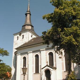 The Erlöserkirche stands on a small hill in the old town center, featuring a classical nave with rounded windows and distinguishing pilasters.
