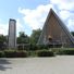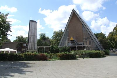 The Evangelische Kirche Alt-Lietzow features a distinctive tent-shaped main structure with a separate bell tower and community hall connected by covered walkways.