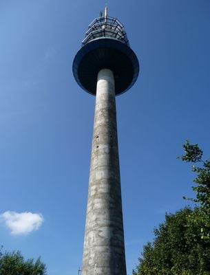 The concrete tower rises 137 meters into the sky, serving as a central telecommunications structure in North Rhine-Westphalia with multiple broadcasting antennas.