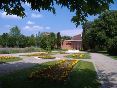 The 20-hectare green space features various water elements, including a fountain, a stream, and a small lake along the Danube River.