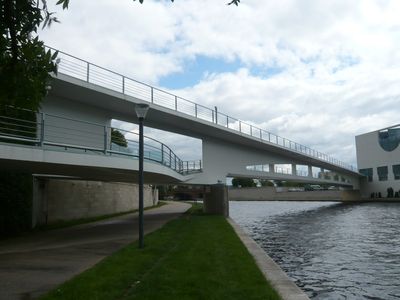The bridge intersects with Berlin's governmental center, reflecting Germany's commitment to open administration through its accessible pedestrian pathways.