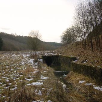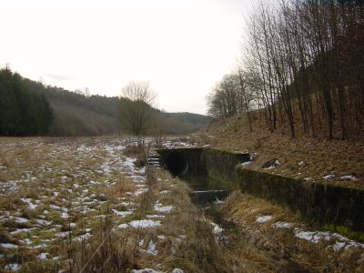 Following the 1984 dam failure that caused 33 million Deutsche Mark in private property damage, only the ground outlet and stilling basin remain visible today.