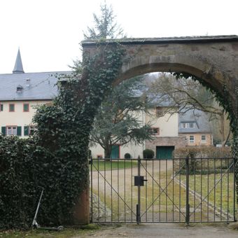 Nothgottes is a monastery set in a wooded valley of the Rheingau Hills south of Rüdesheim am Rhein, featuring a Gothic church from the 15th century. The complex comprises multiple buildings arranged around a central courtyard, with open spaces and paths leading to the surrounding countryside.