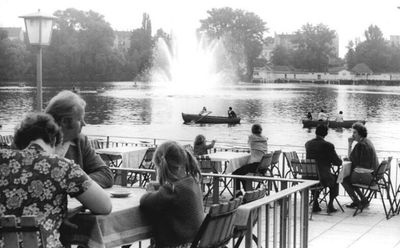 A 1.3-kilometer barrier-free circular path surrounds the lake, connecting various facilities including boat rentals, playgrounds, and the historic Milchhäuschen restaurant.