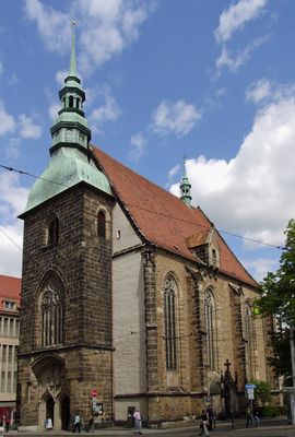 Frauenkirche is a Gothic church in Görlitz's old town featuring two distinctive towers that rise nearly 52 meters above the surrounding buildings. The structure displays typical Gothic characteristics such as pointed arches and vertical lines that draw the eye upward.